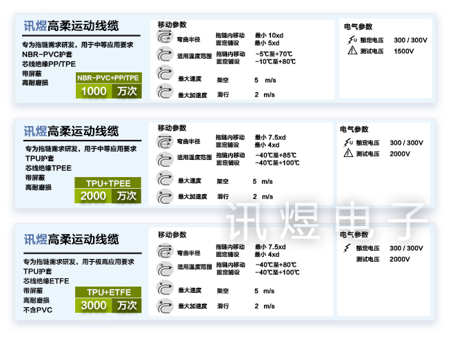 讯煜电子的高柔运动线缆按“运动次数”可分为: 1000万次、2000万次和 3000万次3大类。
